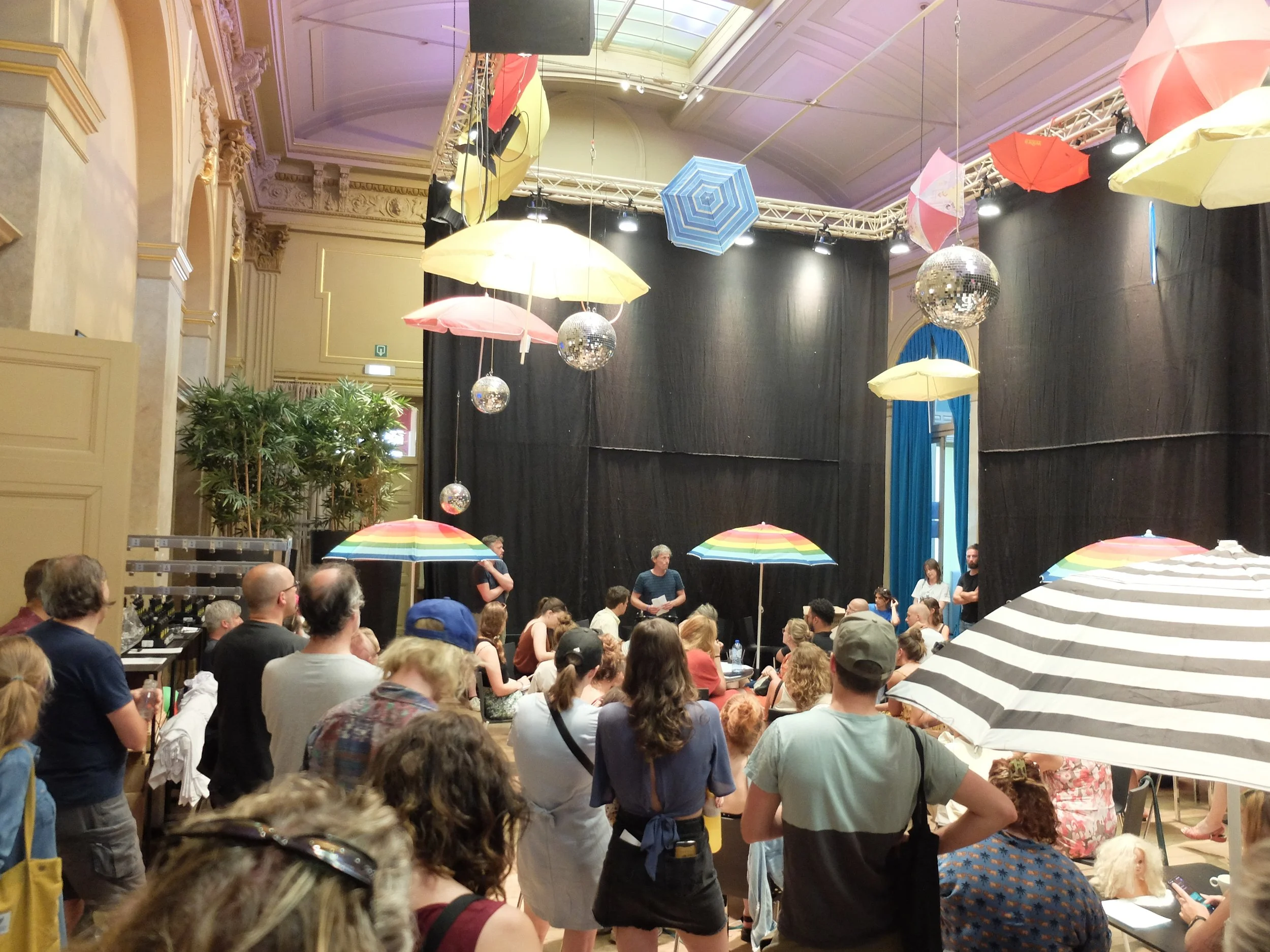 Tomas Raeymaekers van Boomtown en Democrazy verwelkomde iedereen en schetste kort hoe het festival met herbruikbare bekers (sinds 2016) en de overstap naar een exclusief vegetarisch aanbod het verschil probeert te maken en zoekt naar een haalbare toekomst. Wat volhoudbaarheid (de nieuwe naam van duurzaamheid) precies inhoudt, legde Nathalie Decoene van de Gentse think & do tank Greentrack uit. Volhoudbaarheid focust niet alleen op ecologie maar evenveel op participatie, emancipatie, diversiteit, verdraagzaamheid en gendergelijkheid. Het Pulse Netwerk is een motor in de Vlaamse en Brusselse cultuur-, jeugd- en mediasector en zet praktijksafari’s (zoals deze) in voor een haalbare transitie. Het delen van praktijkervaring, was volgens Pieter Delafortrie één van de snelste stappen voorwaarts. Ook de medewerkers van Refu Interim zorgen al jaren mee voor een gezellig Boomtown. Farah Laporte had het over vrijwilligerswerk voor mensen die nieuw zijn in België en de meerwaarde van deze ‘interimmers’.